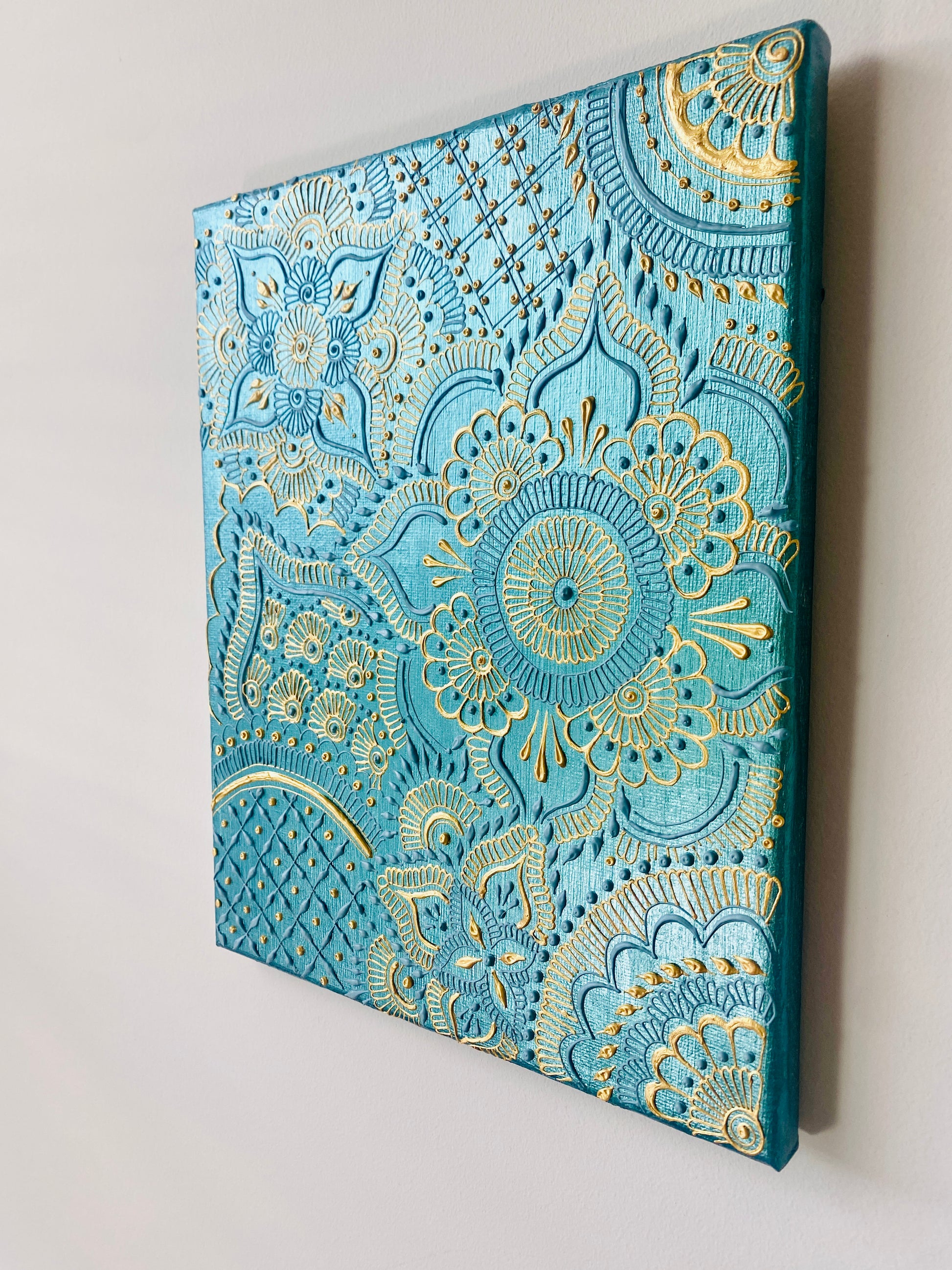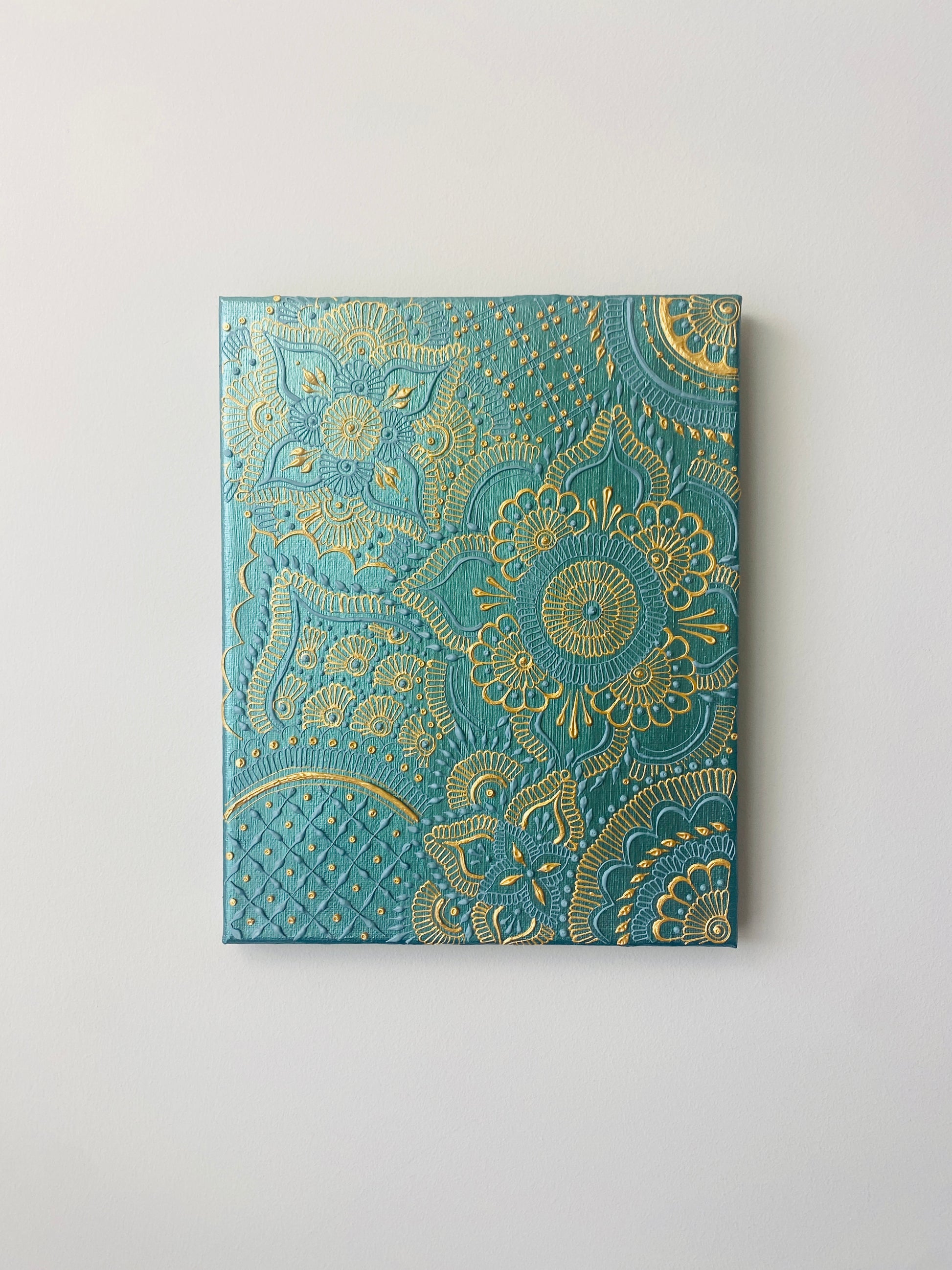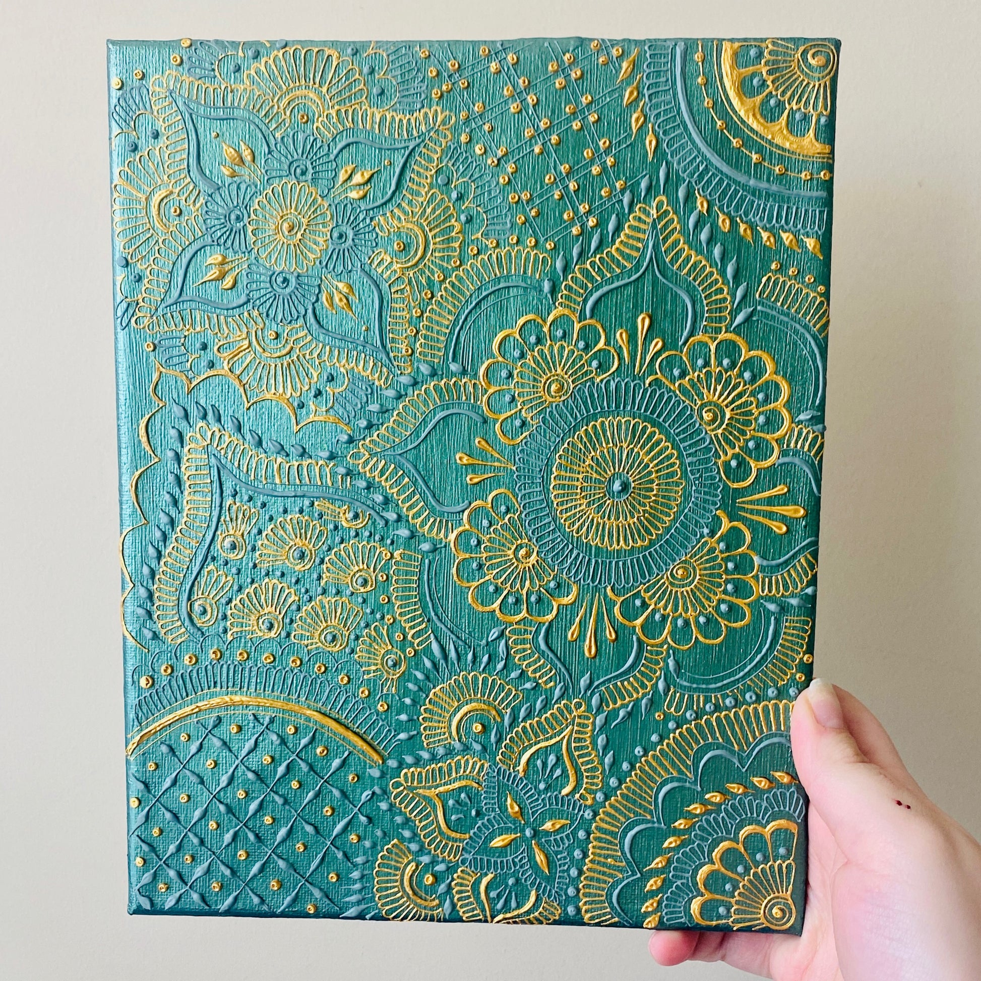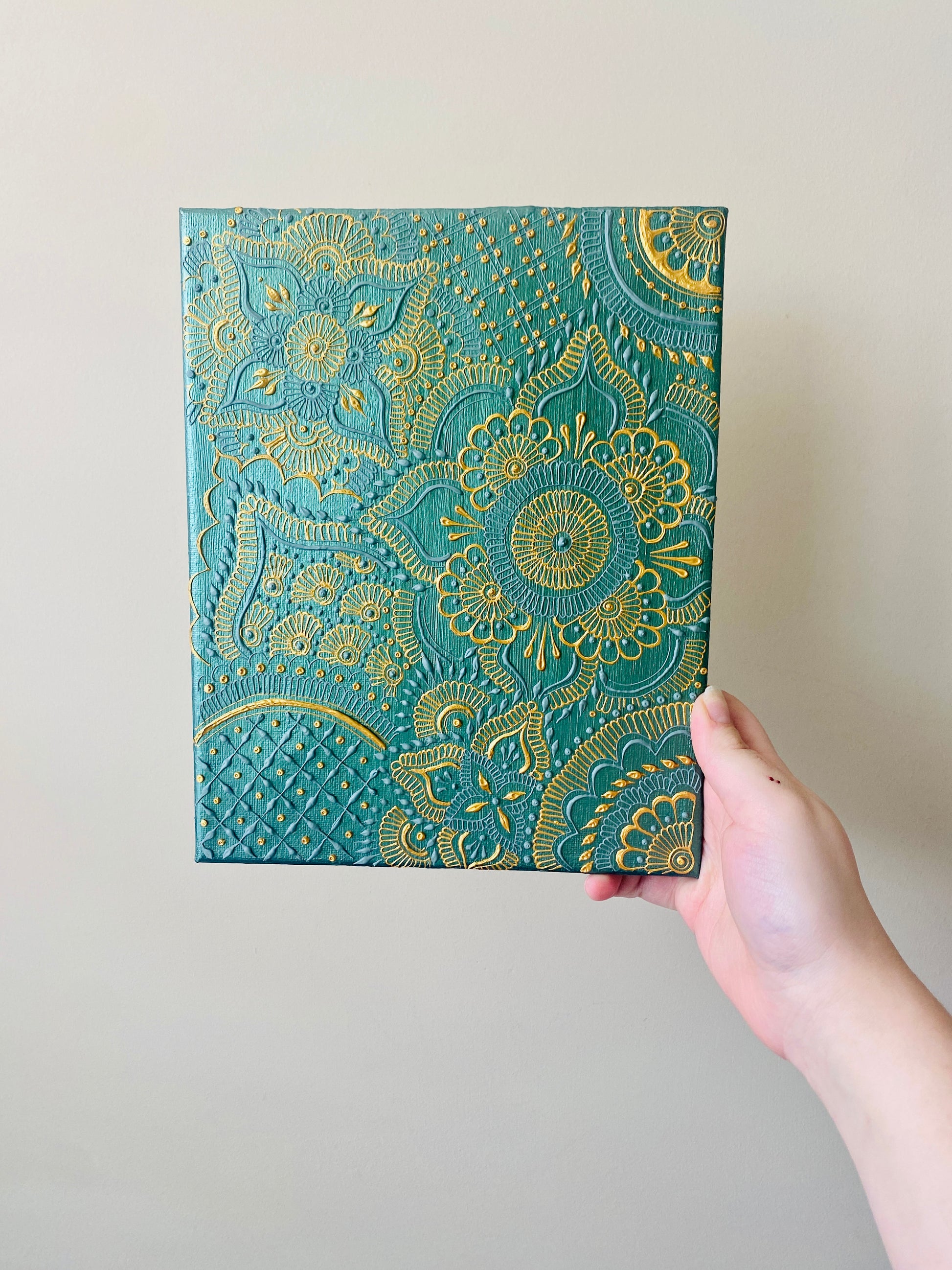 This is a dark green shimmer canvas that is hand painted with intricate henna designs. The canvas is 8"x10" and is a one of a kind piece. Add this unique art to your collection or gift it to a friend.