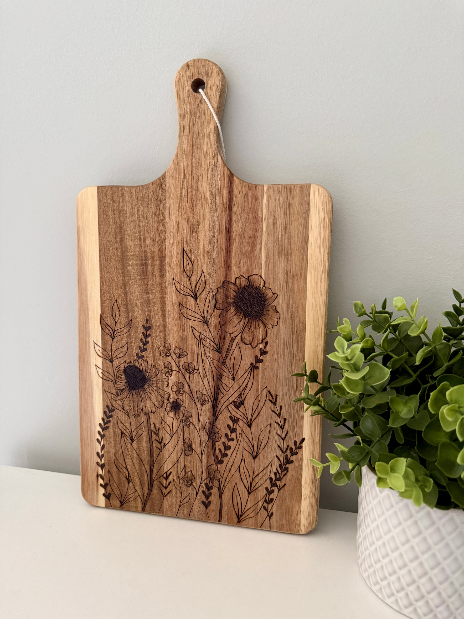 The rich, varied grain of the acacia wood provides a beautiful, natural contrast to the intricate, hand-burned wildflower motif.