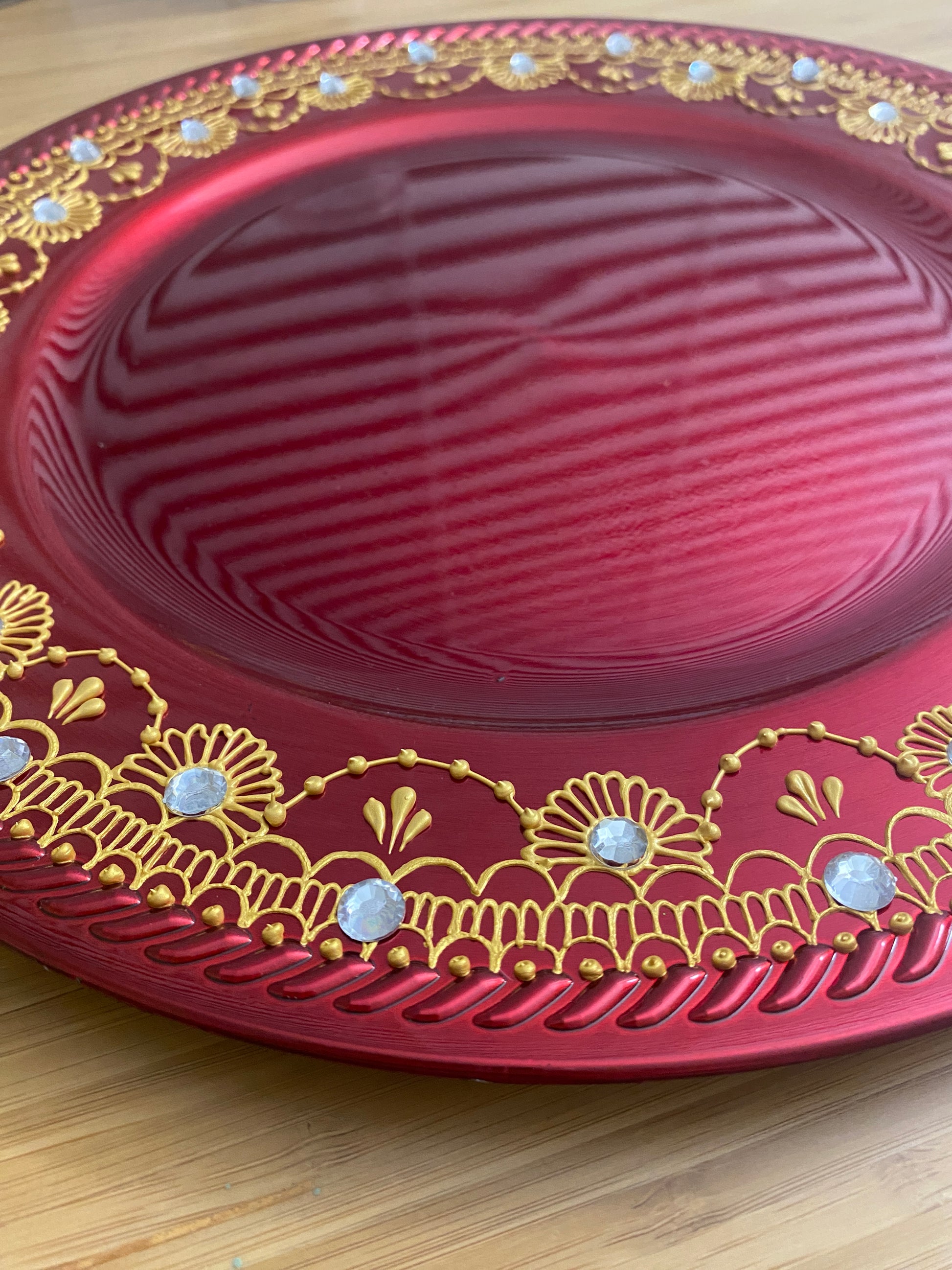 Elevate your table setting with this stunning, hand-painted charger plate. Meticulously decorated with a vibrant, intricate henna-inspired design, this piece is a true work of art. The rich metallic red base is beautifully complemented by shimmering gold paint and sparkling gemstone accents, creating a luxurious and elegant look.