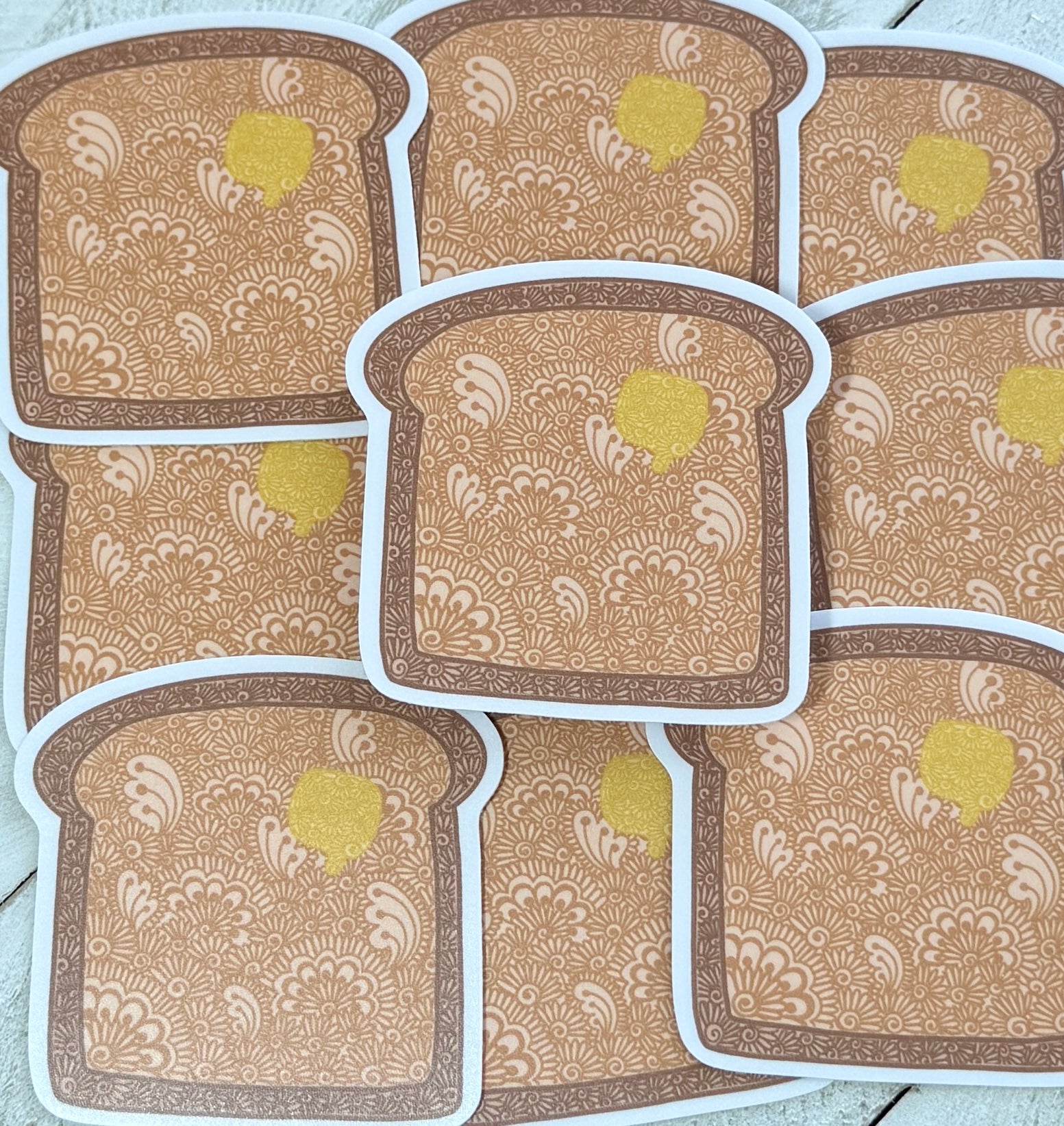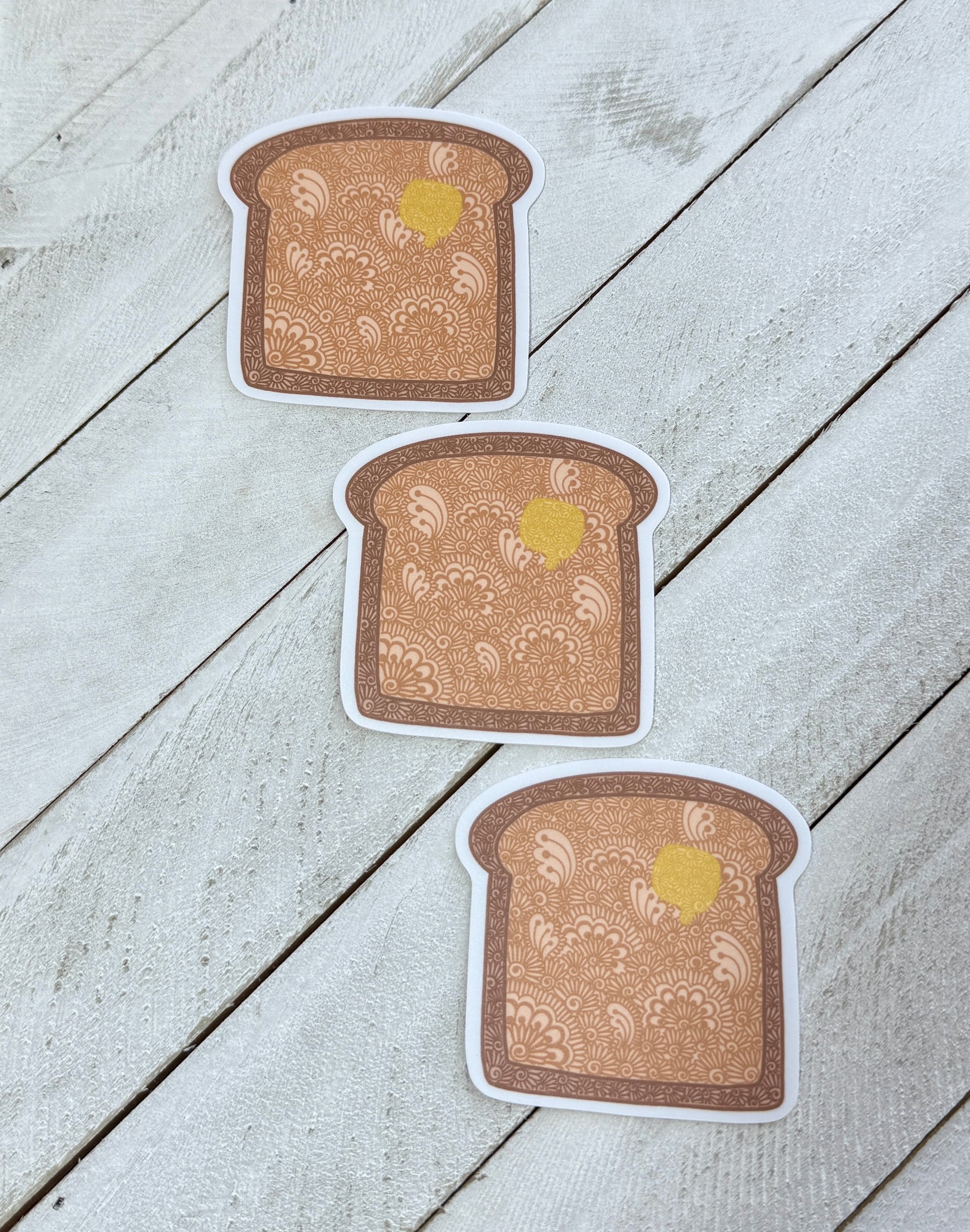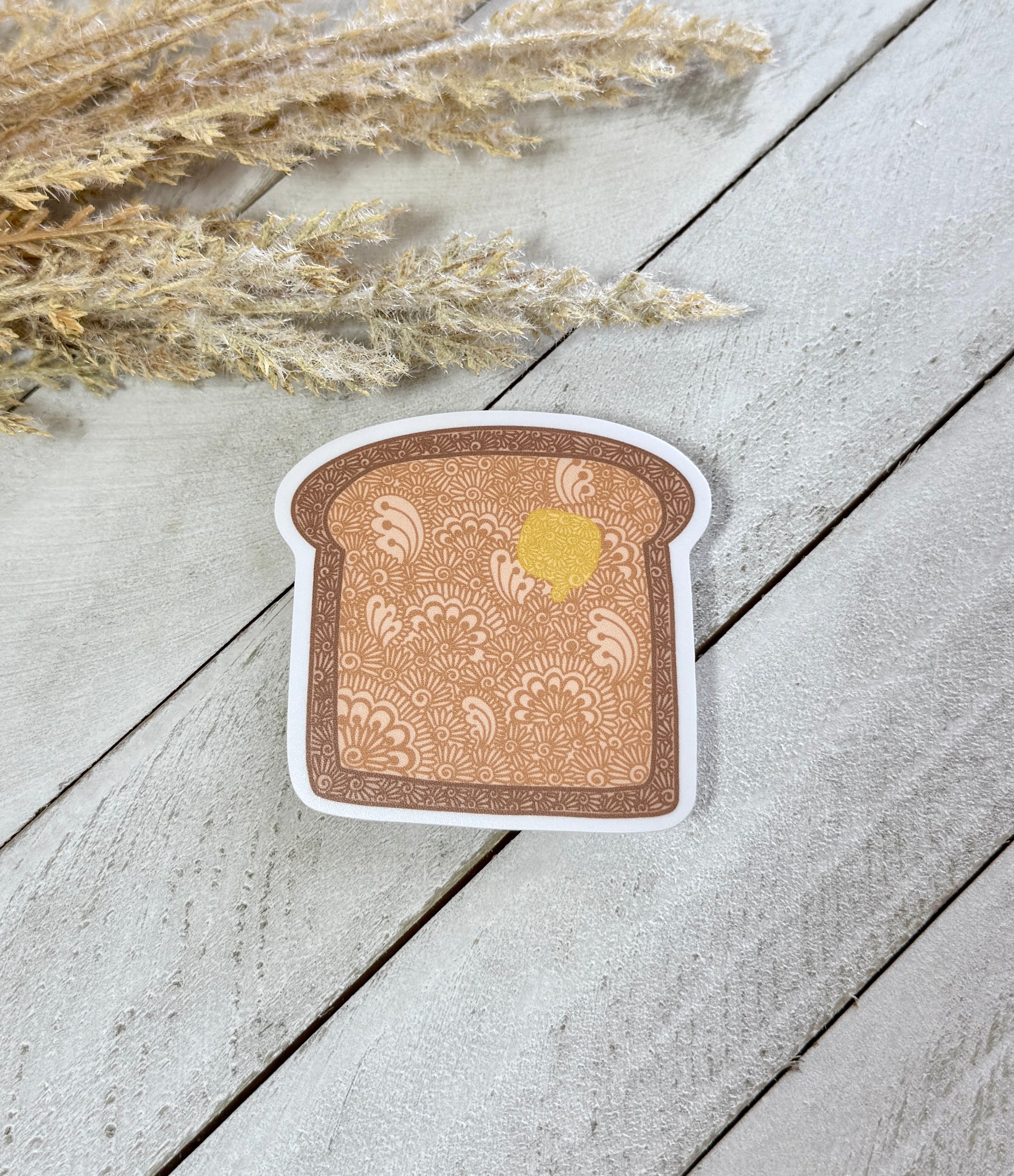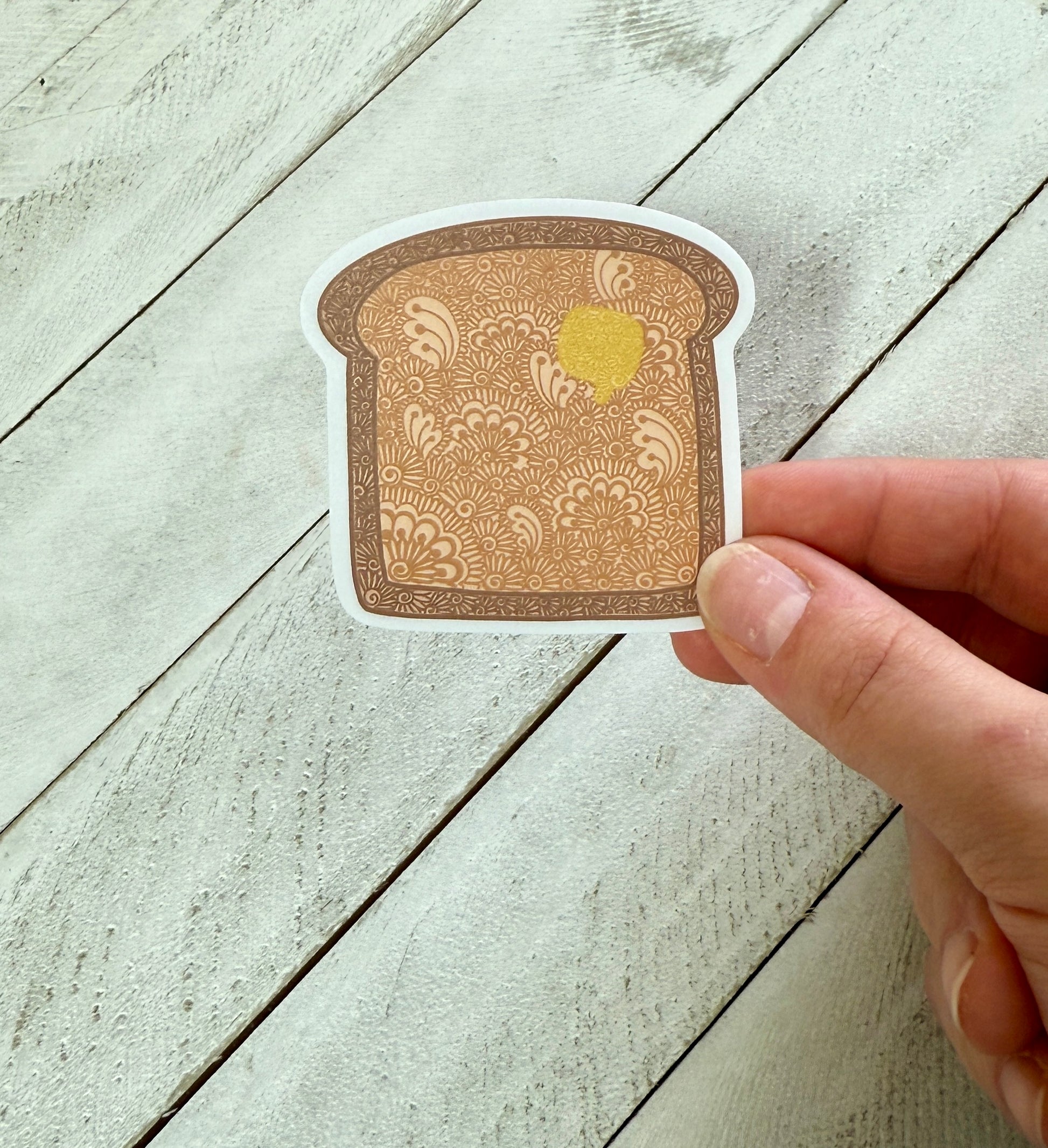 Why settle for plain toast when you can have a beautiful piece of art? This unique sticker features a slice of toast with a pat of butter, filled with an intricate, hand-drawn henna-inspired design. It's a fun and quirky way to add a touch of personality to your belongings. This high-quality vinyl sticker is a one-of-a-kind creation, perfect for anyone who loves breakfast, art, and a little bit of unexpected charm.