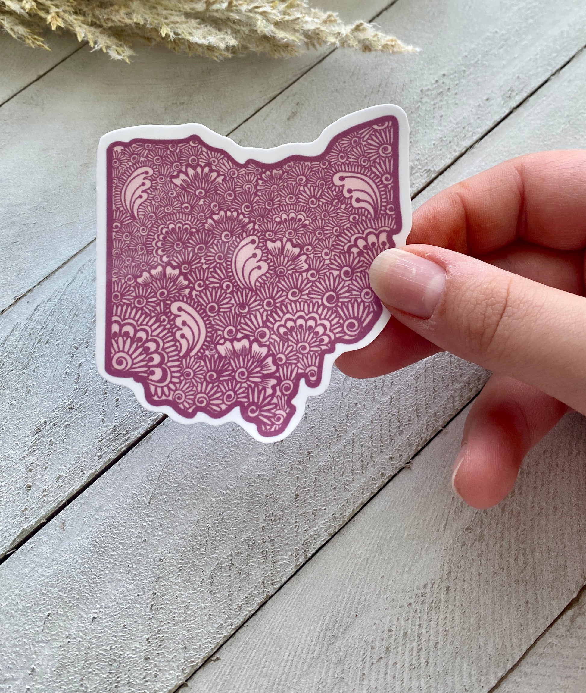 This high-quality vinyl decal features a stunning, hand-drawn floral pattern intricately filling the shape of Ohio. It's a beautiful way to show off your state pride, whether you're a proud resident, a native living away, or a fan of the state's unique character.