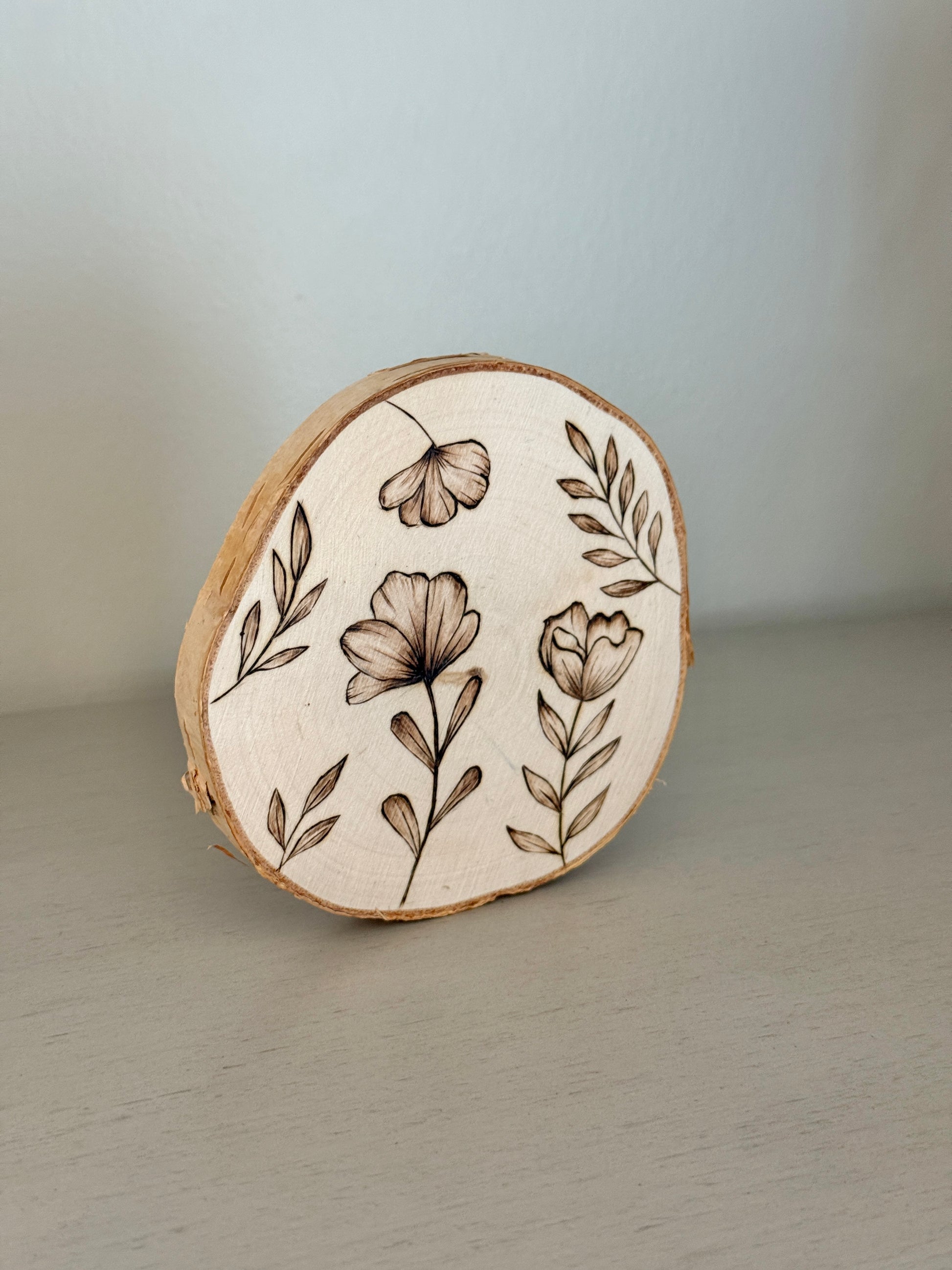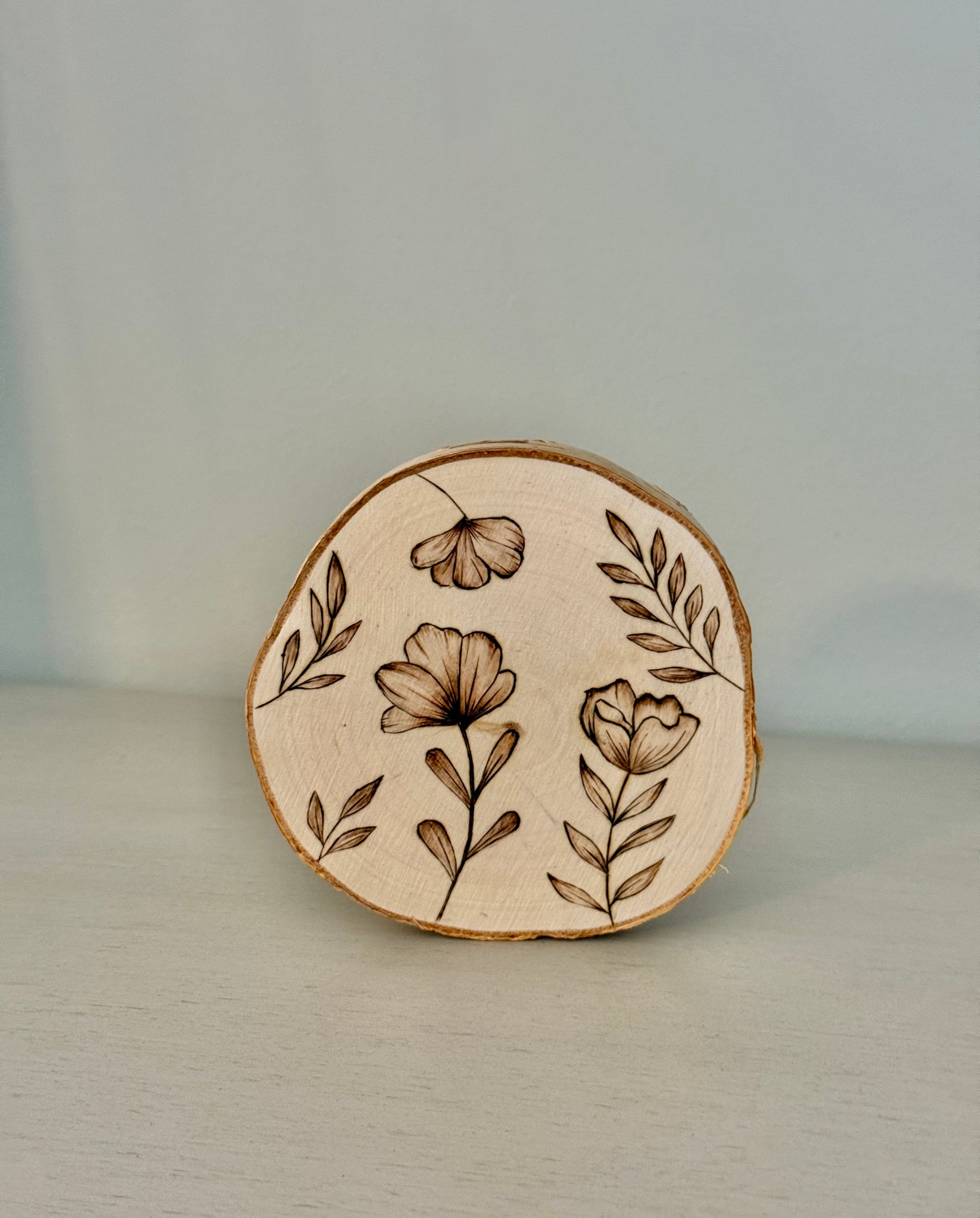 Bring a touch of nature's beauty into your home with this charming, hand-burned floral design on a natural birch wood slice. Measuring approximately 3 inches in diameter, this piece features a collection of delicate flowers and leaves, carefully drawn and burned to create a unique and rustic piece of art. The natural bark edge adds to its organic appeal, making it a lovely addition to your gallery wall, shelf decor, or as a unique small gift.