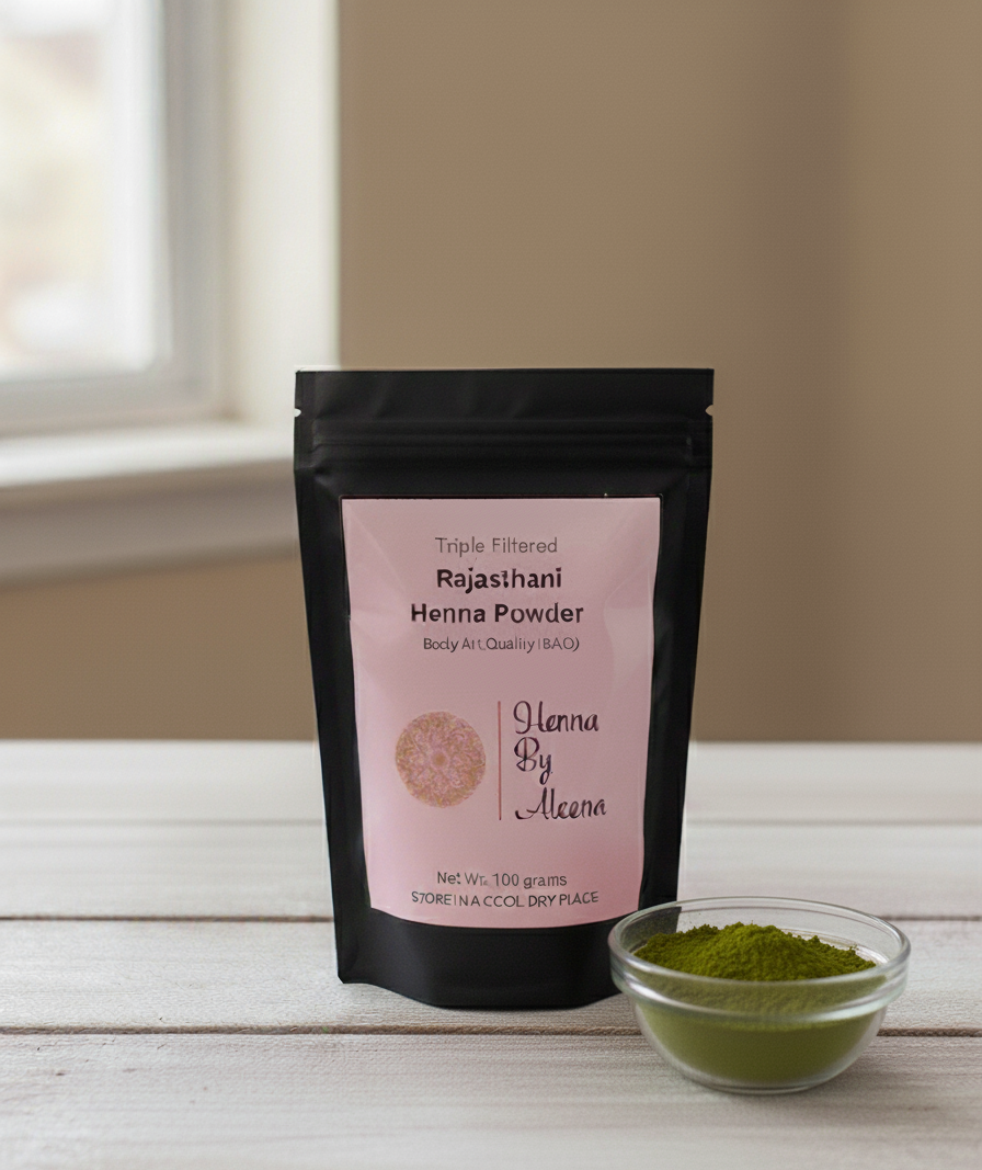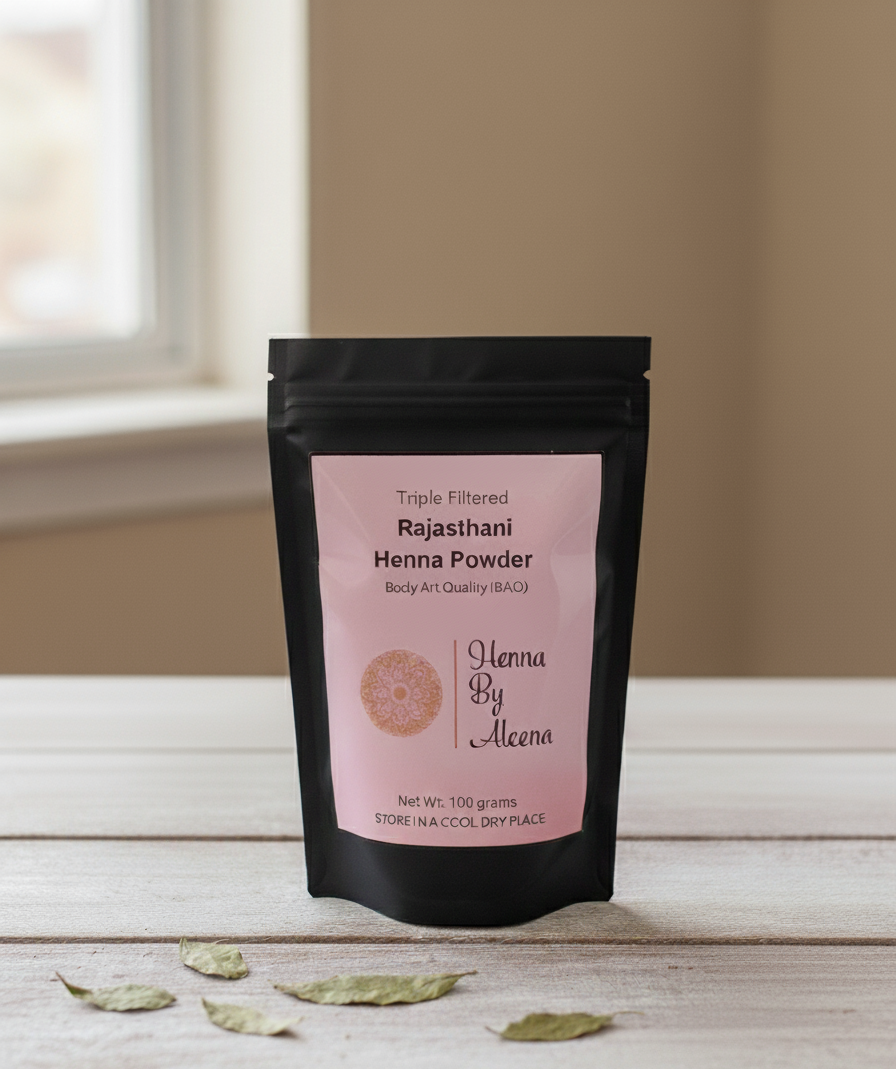 Organic Rajasthani Henna Powder. Triple filtered to create a smooth fine paste. Body Art Quality Henna. The powder provides a deep red/brown stain.