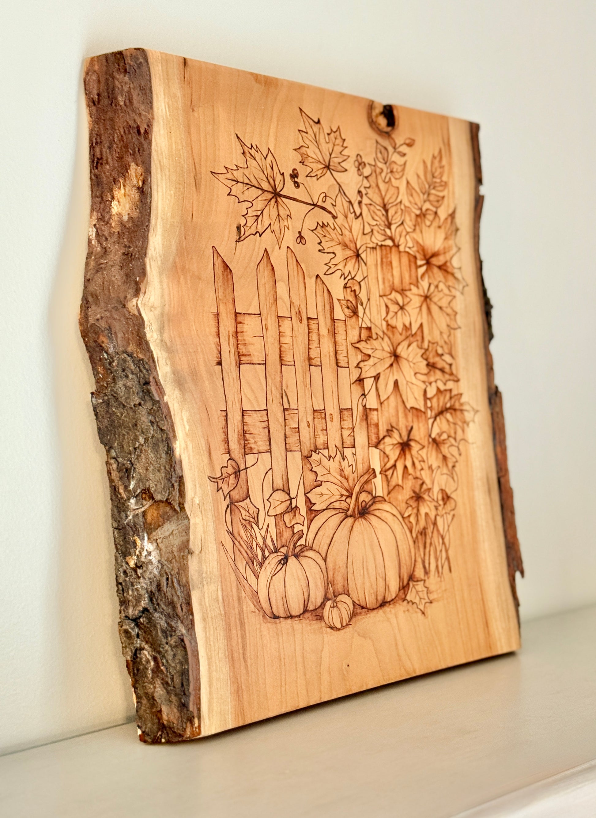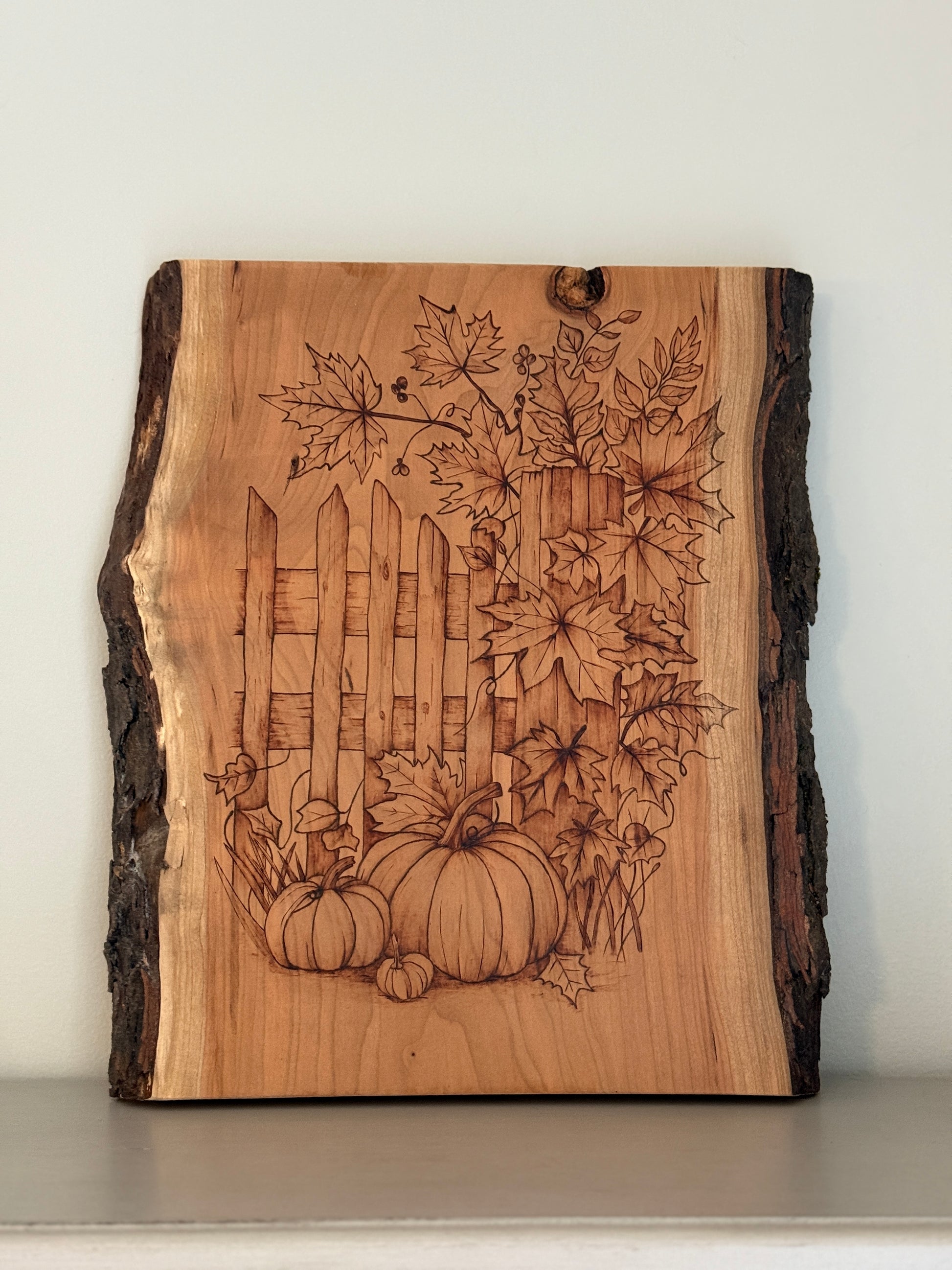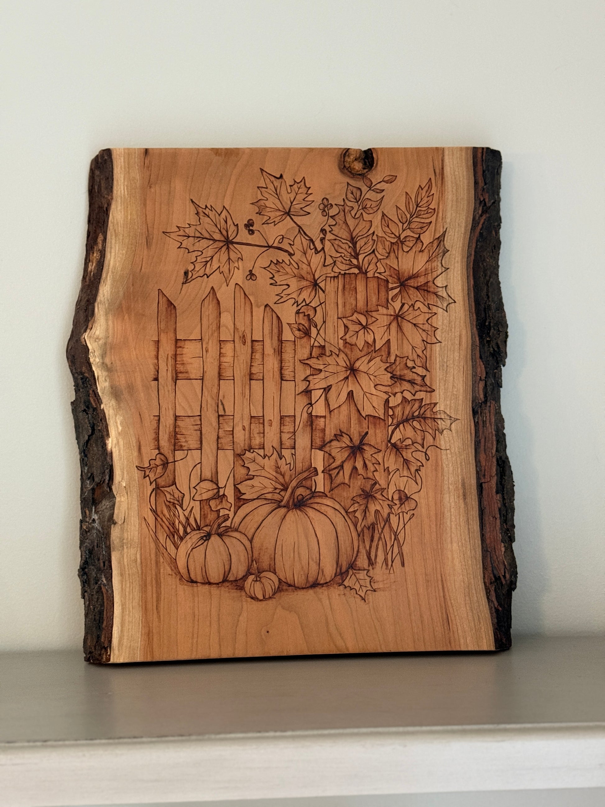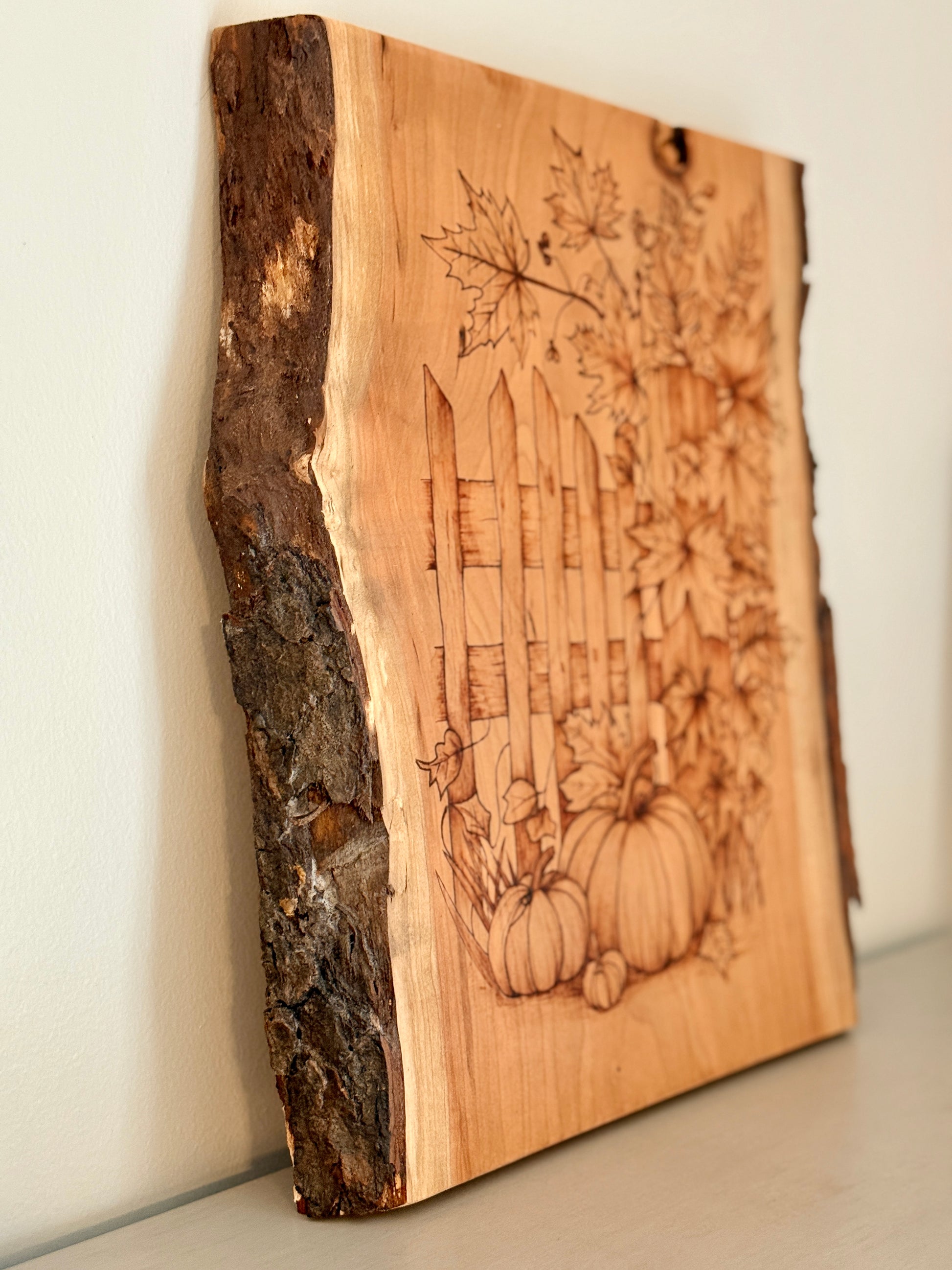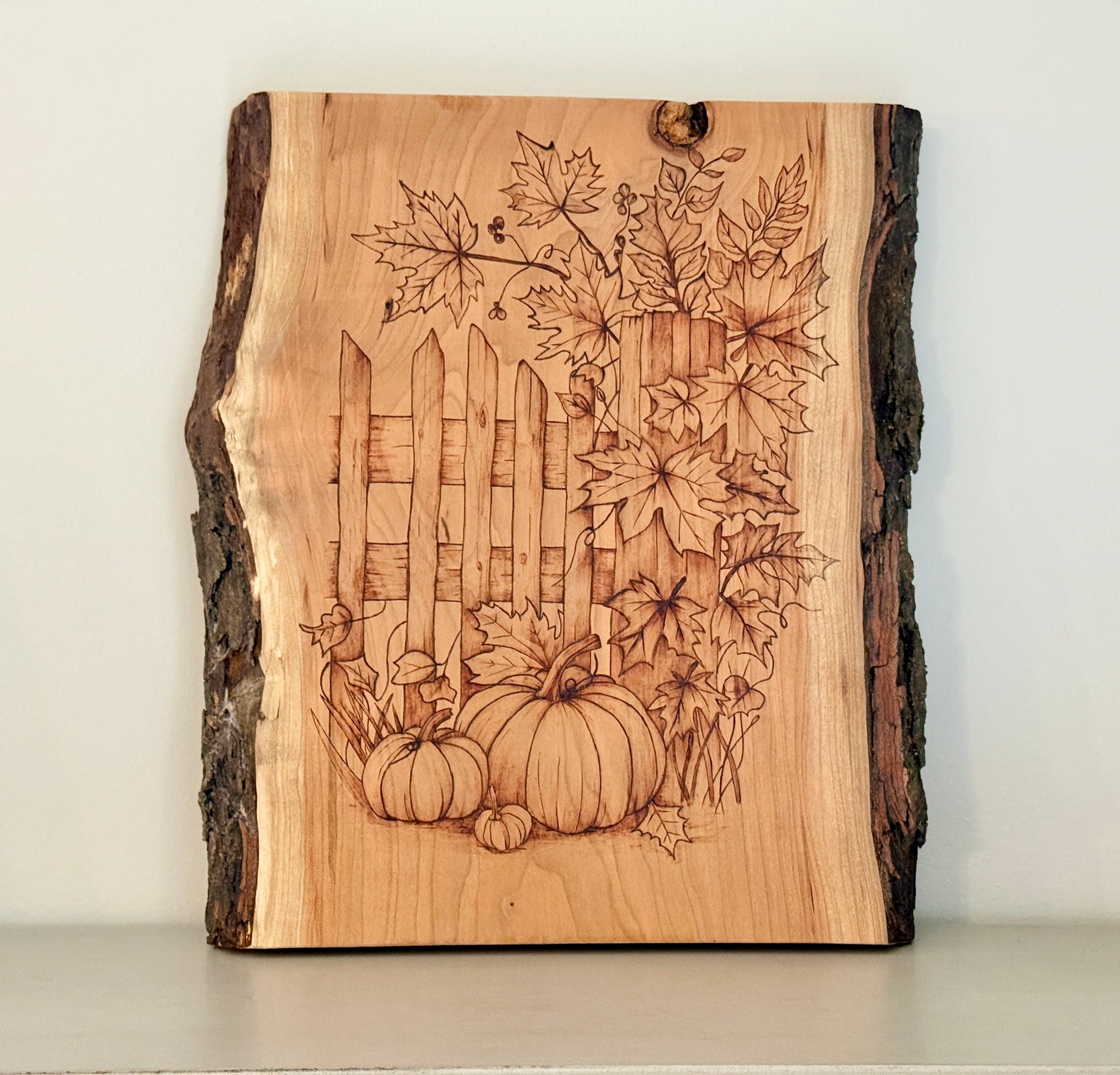 Fall Garden Scene Pyrography on Live Edge Cherry Wood