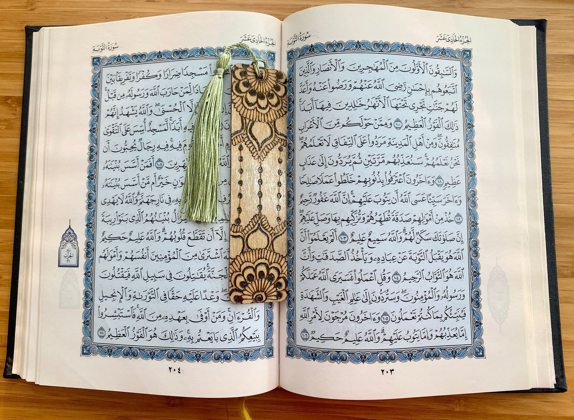 Each bookmark is handmade featuring a beautiful floral henna design. The bookmarks are then stained a light brown color and coated in a polyurethane finish to improve durability.