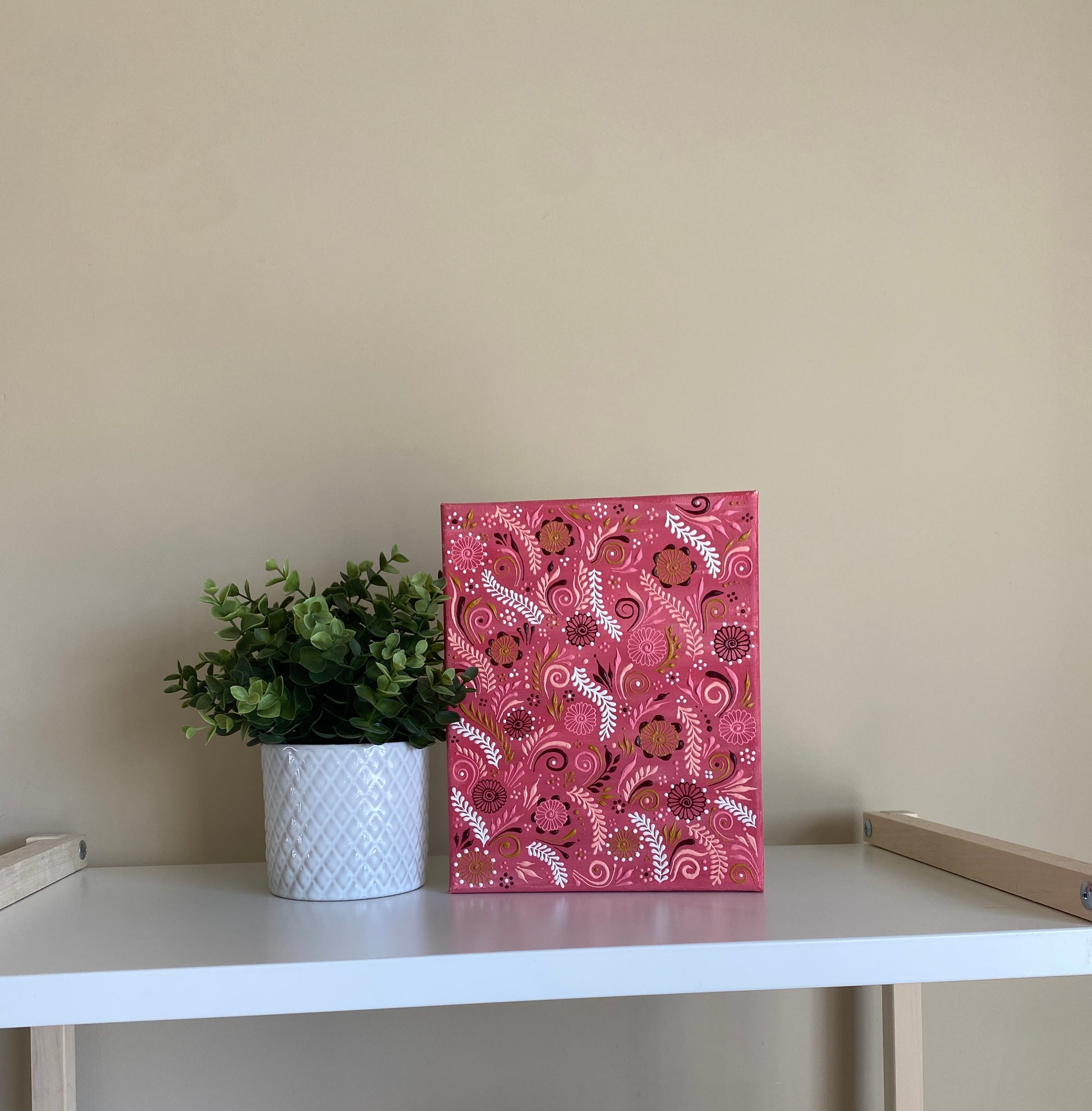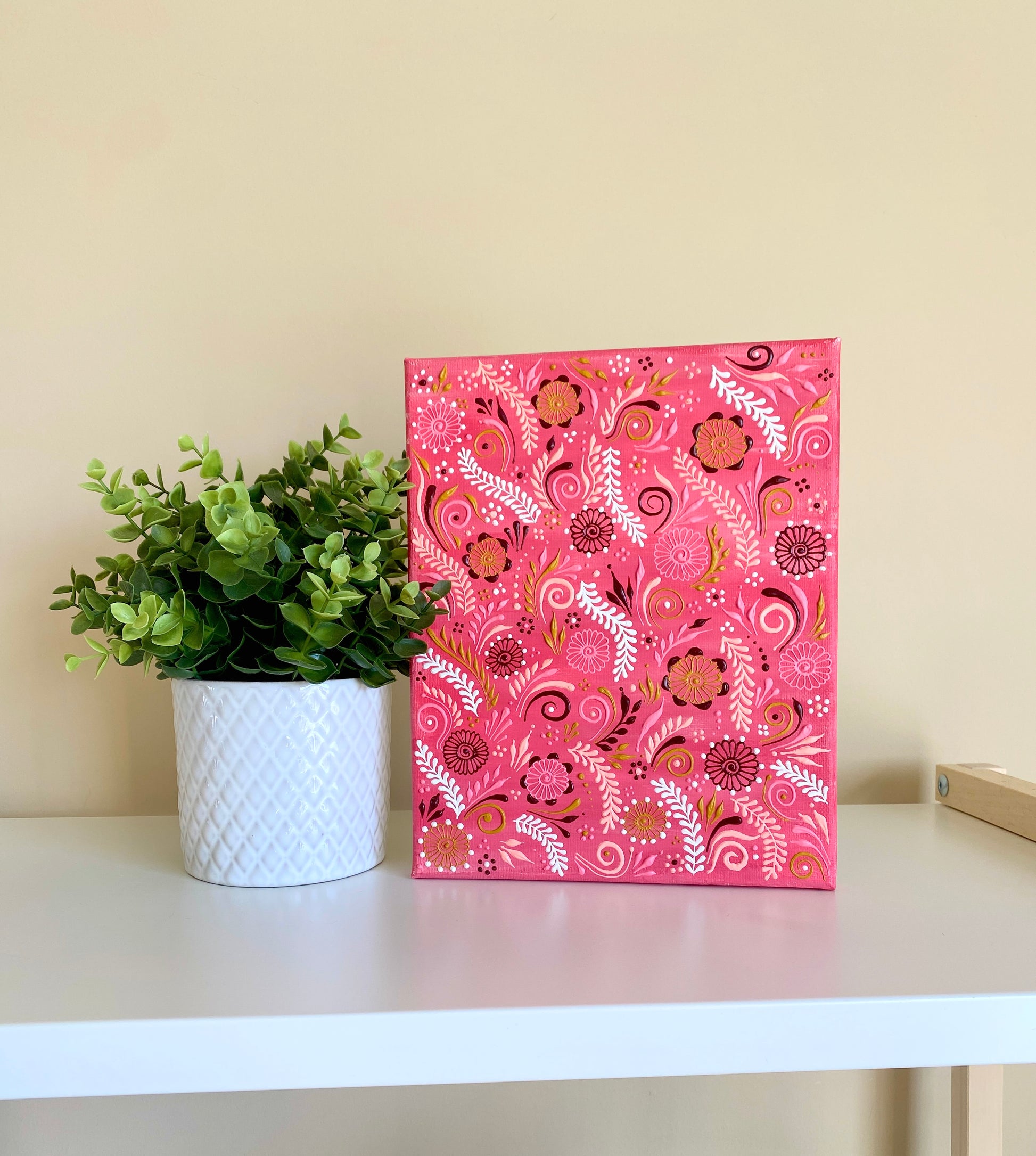 This is a henna inspired canvas painting. The light floral colors pop against the vibrant pink background, drawing the viewer's eyes to the details. This canvas is 8"x10" created with acrylic paints. It would make the perfect addition to any office or living room.