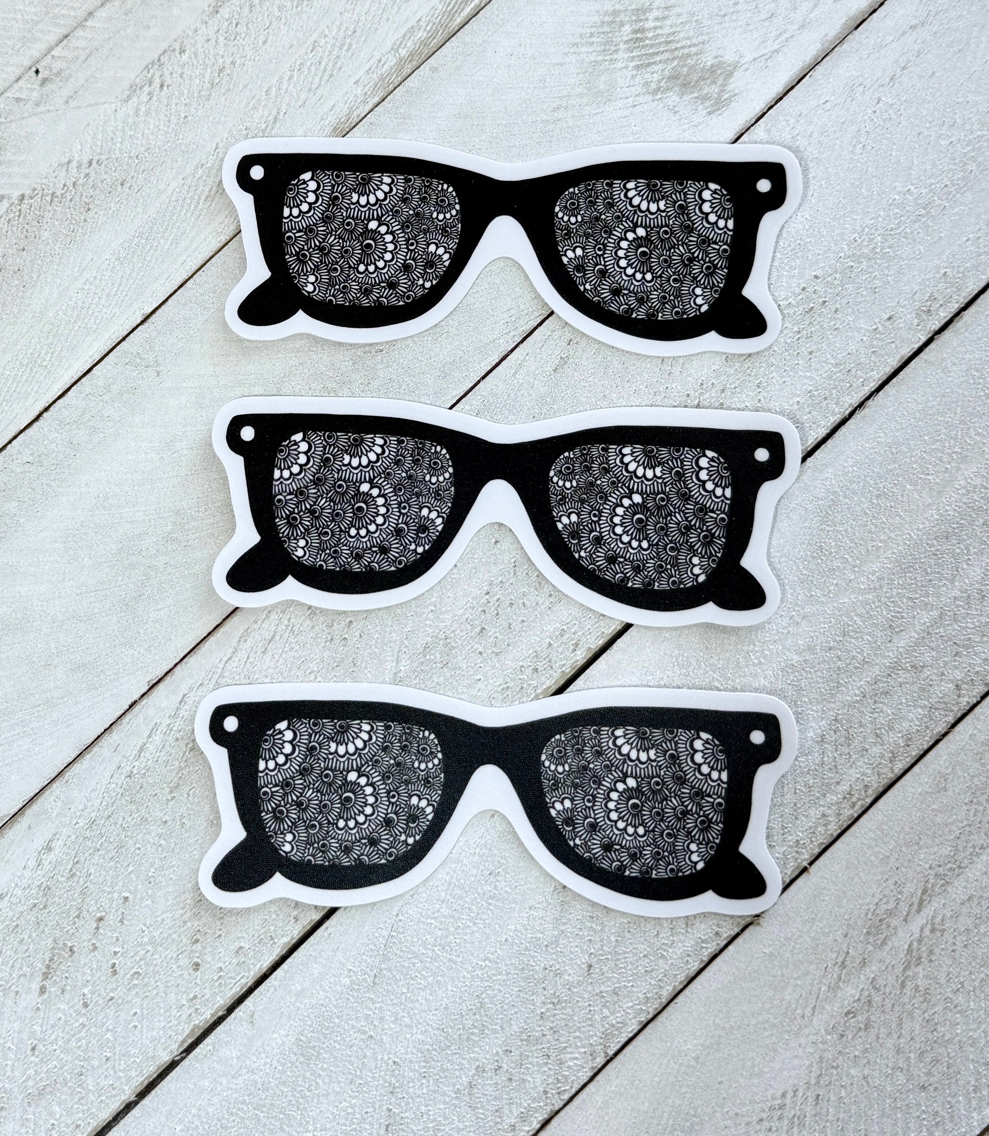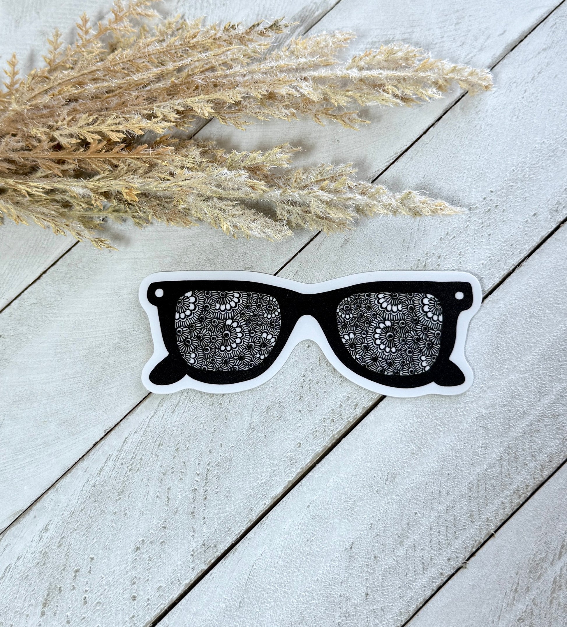 Add a touch of cool and a pop of intricate art to your belongings with this one-of-a-kind sticker. Featuring a classic pair of sunglasses with a detailed henna-inspired design filling the lenses, this decal is a perfect blend of style and creativity. It's an original, hand-drawn design that makes a statement wherever you place it.