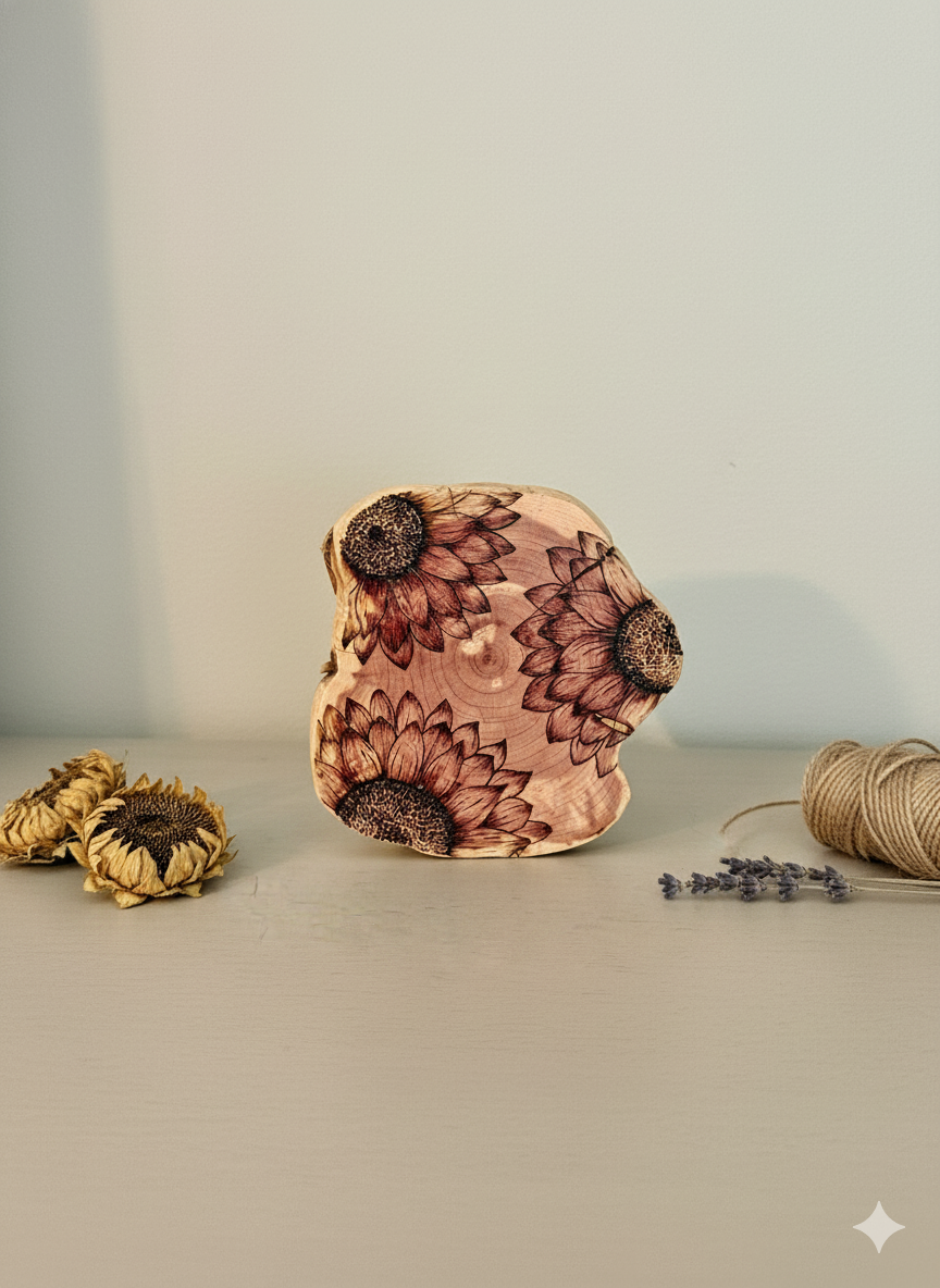 Brighten your space with this unique hand-burned sunflower design on a fragrant cedar wood slice. The natural variations in the cedar wood grain add to the character of this piece, making it a warm and inviting addition to your home decor or a thoughtful gift for a sunflower enthusiast.