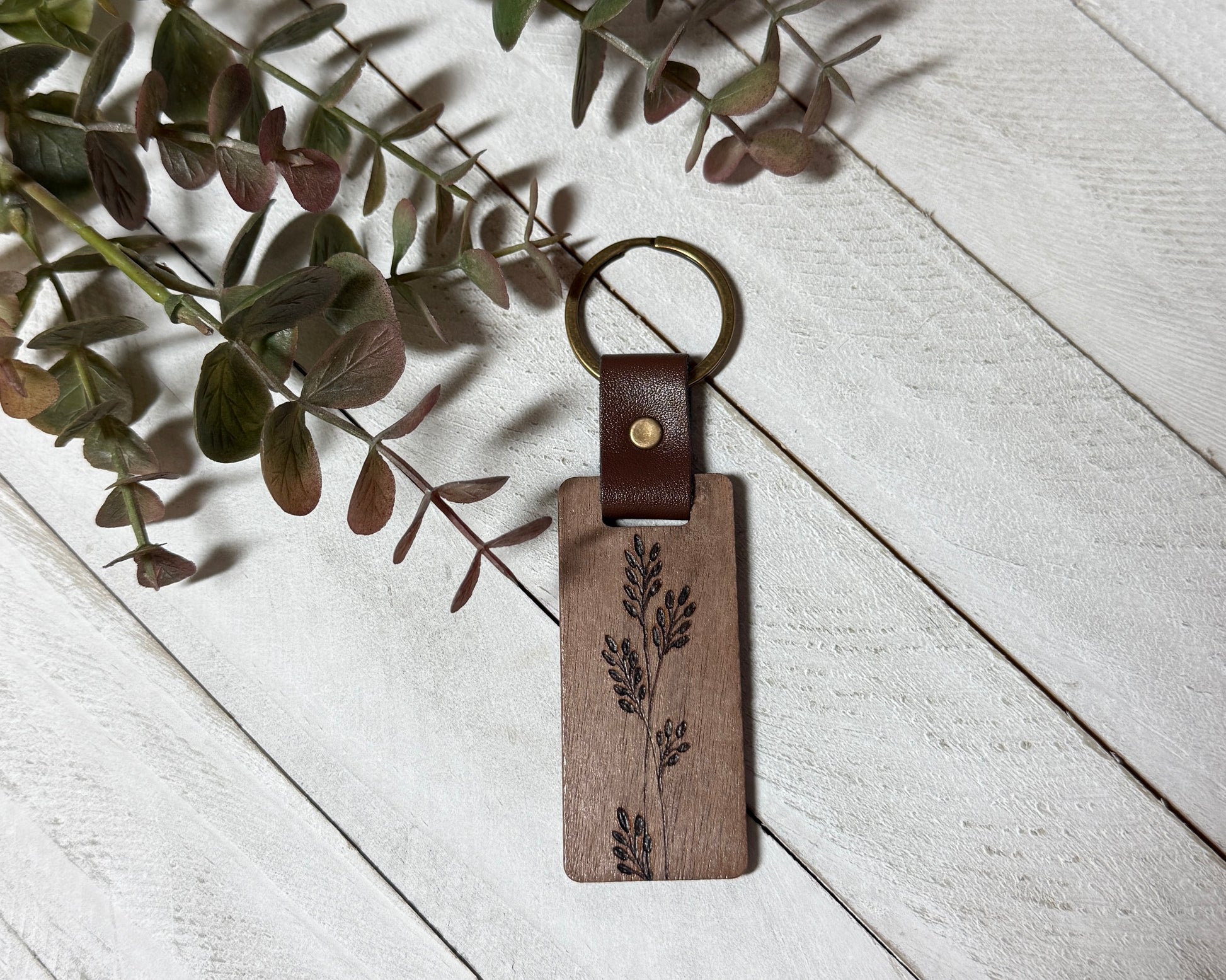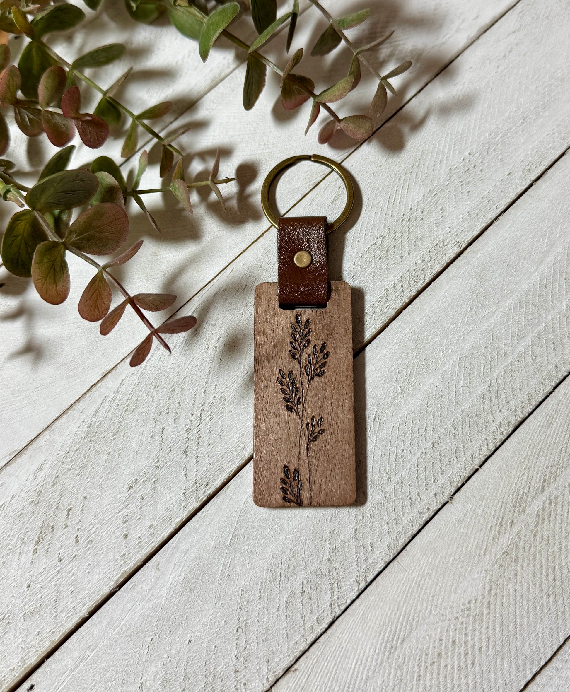 Each keychain features a rectangular piece of natural wood, carefully wood-burned with a delicate botanical design of a slender stem and small leaves.